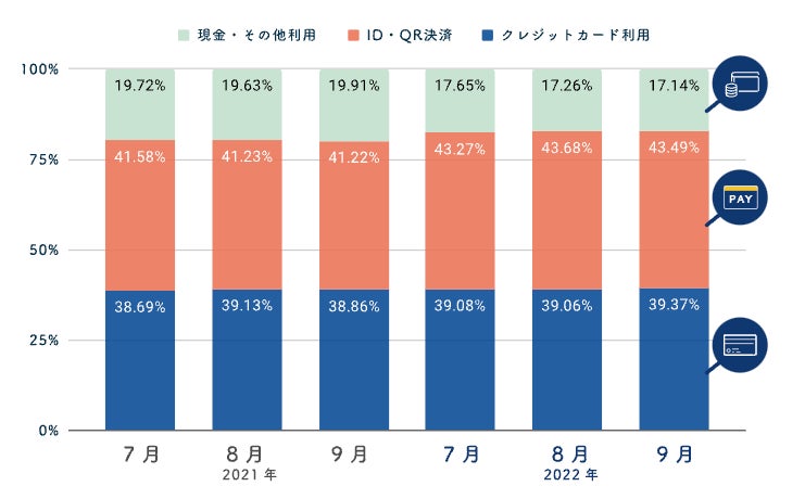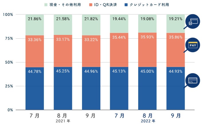 利用された決済方法を「クレジットカード」「ID・QR決済(Amazon Pay、楽天ペイ(オンライン決済)、Apple Pay、PayPay、d払いなどのキャリア決済)」「現金・その他決済(店頭払いや後払い、銀行振込やコンビニ払いなど)」の3つに分け、各月の総注文件数を1とした結果が下記のグラフ1です。