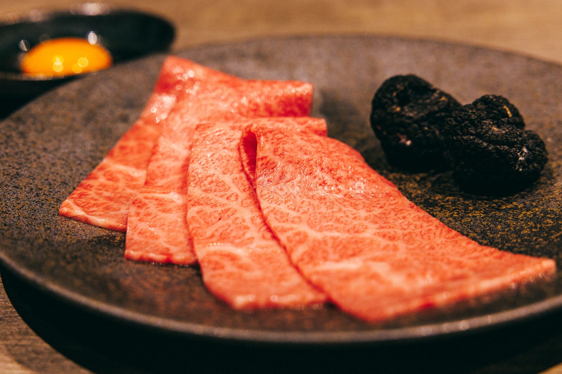 希少部位ザブトンを香ばしく焼き上げて黒トリュフを贅沢にあしらいました。濃厚卵「あわそだち」と特製のタレに絡めてお召し上がりください。