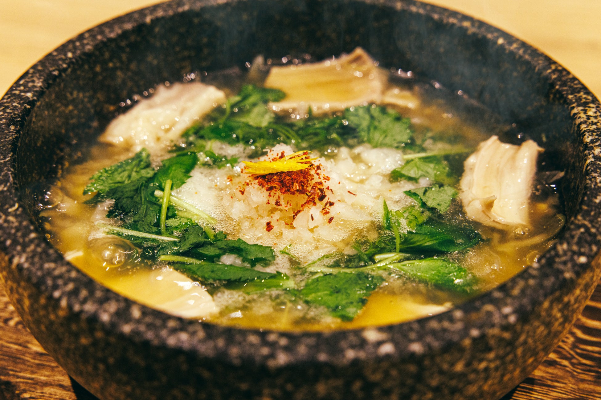 和牛テールと和出汁を合わせた特製スープに柔らかく炊いた旨みたっぷりの“シマチョウ”を添えて、熱々の石鍋で提供いたします。鬼おろしと九条ねぎの食感が心地よい石鍋です。