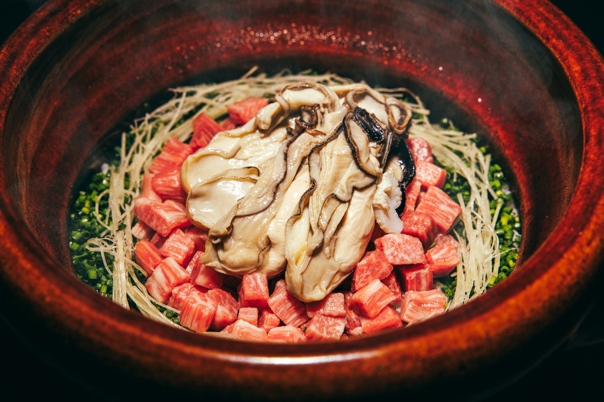 和牛白湯と牡蠣の出汁で炊き上げたご飯に、和牛と鮮度抜群のふっくらとした“牡蠣”を添えました。和牛と牡蠣の旨みが溶け出したクリーミーな新感覚の土鍋ご飯です。