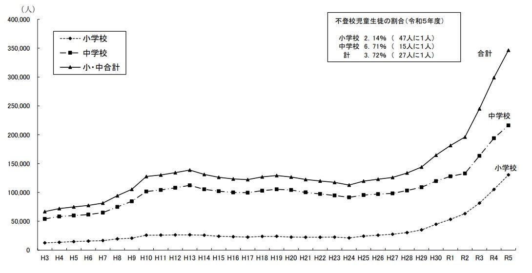 文部科学省の調査によれば、小・中学校における不登校児童生徒数は年々増加の一途をたどり、過去最多を更新し続けています。