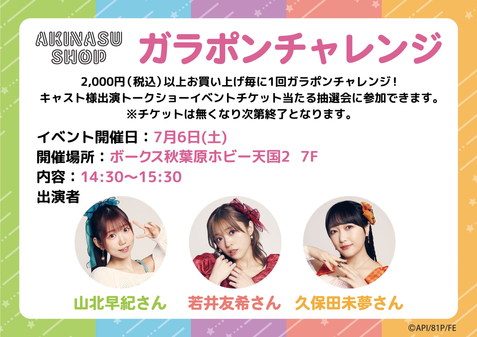 また、2,000円(税込)ごとに、日替わり直筆サイン特製タペストリーと7月6日(土)に行われる「i☆Ris」メンバーの山北早紀さん、岩井友希さん、久保田未夢さんが出演するトークショーイベント参加チケットが当たるガラポンにチャレンジできます。