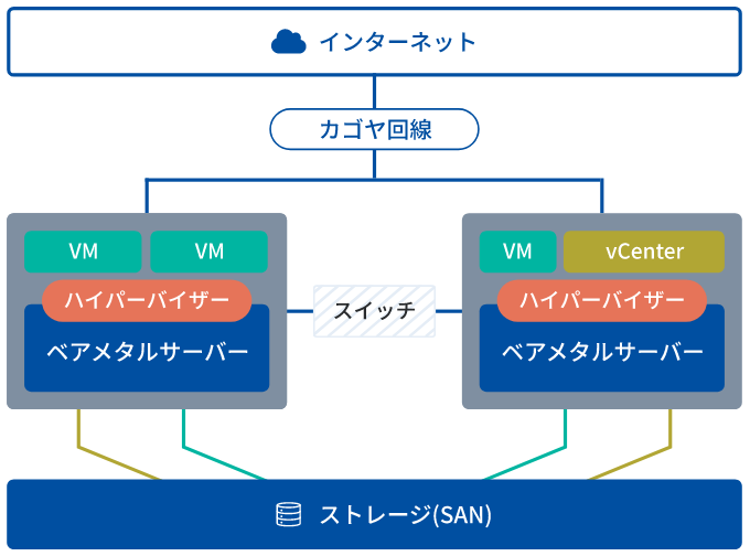 KAGOYA FLEX 「プライベートクラウドパッケージ HA」 は、冗長構成のホストサーバーと共有ストレージでvSphereベースの仮想環境が構築済みなので、ライブマイグレーションにも対応した障害に強いプライベートクラウド環境を設定作業の費用や工数をかけずに簡単に導入いただけます。