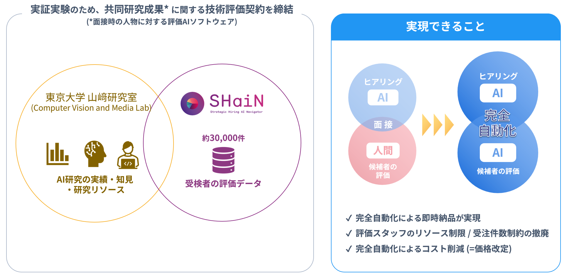 これらの課題を解決するために、「評価」の部分においてもAIによる自動化が必要と考え、評価データの蓄積とAI・ディープラーニング等の技術を組み合わせたシステムの開発を進めてきました。2020年からは知覚情報処理を専門とする東京大学大学院情報理工学系研究科 山﨑俊彦教授(Computer Vision and Media Lab)との共同研究をスタート。共同研究成果である「面接時の人物に対する評価AI」プログラムが、このたび、サービスに求められる条件をクリアしたと判断し、実証実験を開始することとなりました。