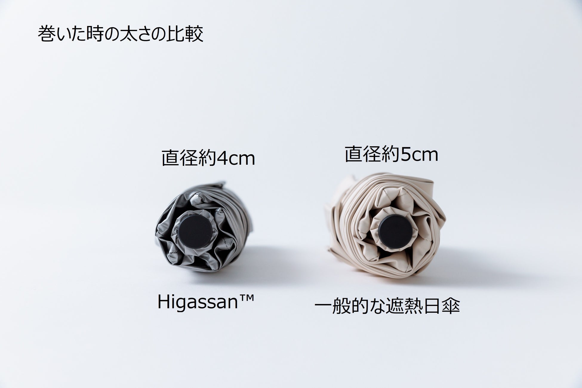 また、「Higassan™」の傘骨の一部にはカーボンを用いており、傘本体の重量はスマホよりも軽い1本あたり約140g、畳んだときの直径も約4cmとかばんに入れても軽く、かさばりづらいため持ち運びに最適です。このようにコンパクトでありながら、傘を開いたときの直径は約98cmと大きく、日射を広くカバーすることができます。
