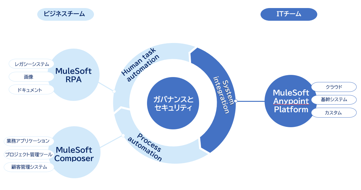 「MuleSoft Automation」は、IT部門が管理する「MuleSoft Anypoint Platform」上で開発したAPIを、ビジネス部門が「MuleSoft RPA」・「MuleSoft Composer」から利用することで、IT部門とビジネス部門が協調し、ハイパーオートメーションを迅速かつIT統制の効いた形で実現することを可能とします。