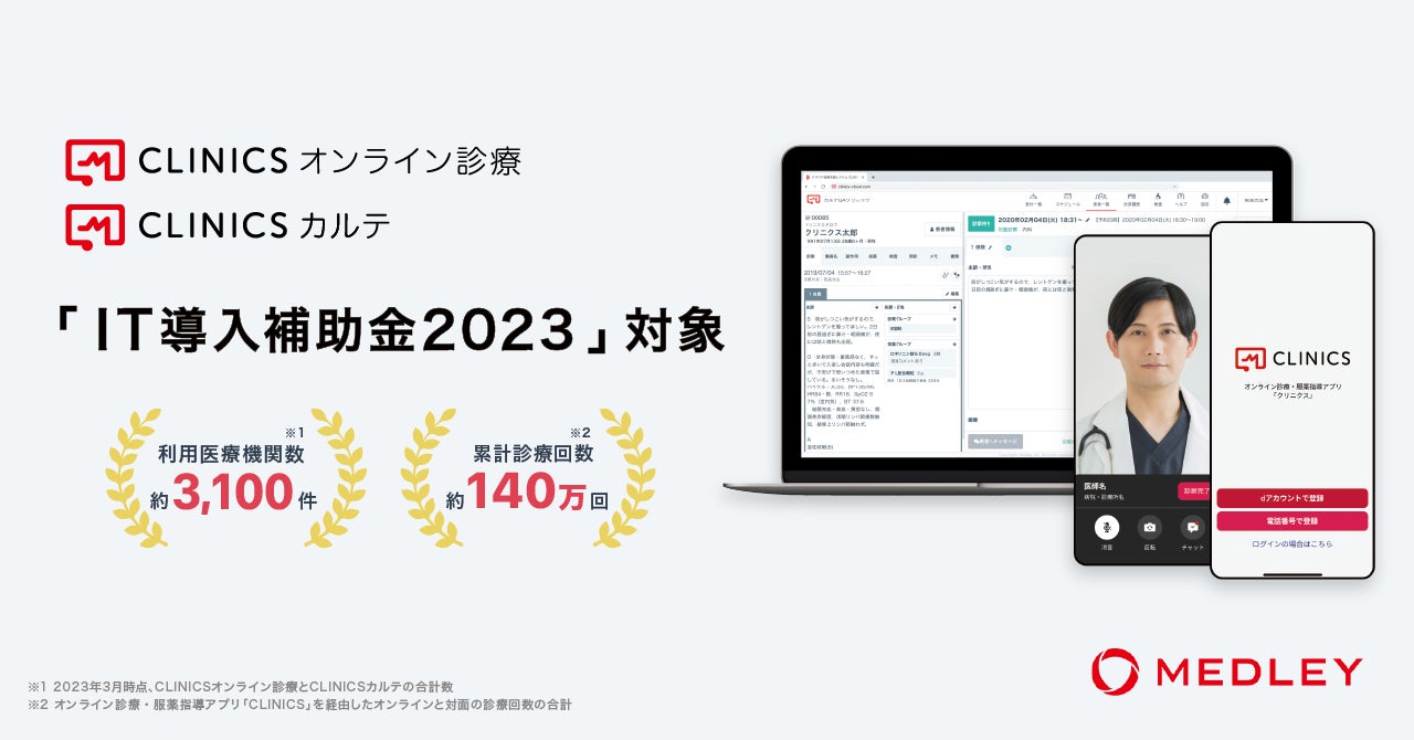 株式会社メドレーは、経済産業省が推進する「サービス等生産性向上IT導入支援事業(以下、IT導入補助金2023)」においてIT導入支援事業者に採択され、当社が提供するオンライン診療支援システム「CLINICSオンライン診療」およびクラウド電子カルテ「CLINICSカルテ」が、補助⾦対象のITツールに認定されたことをお知らせします。