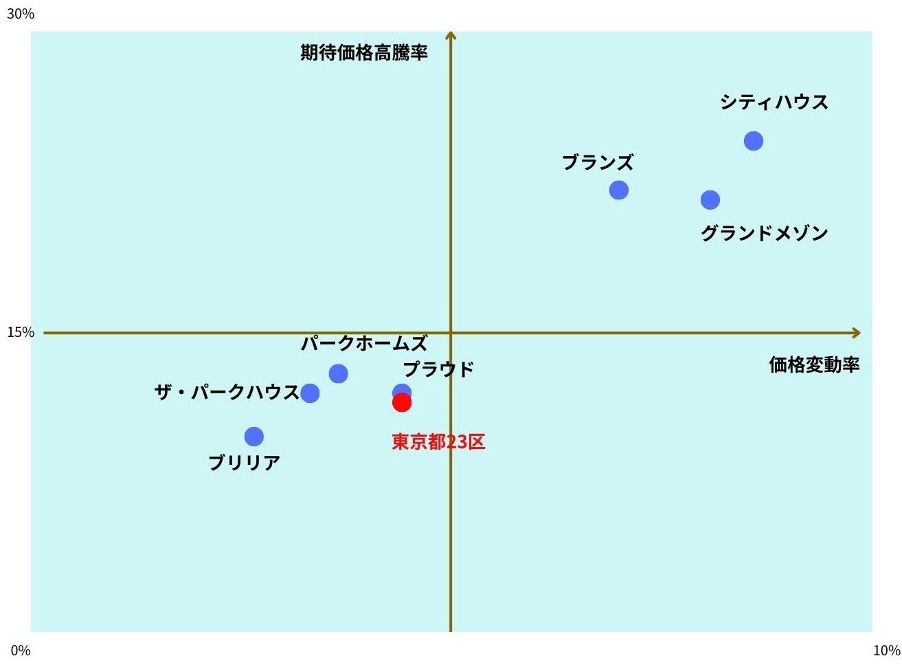 東京都23区全体の中古マンションと相対的に評価をすると「シティハウス」「ブランズ」「グランドメゾン」は「期待価格高騰率」が高いものの、「価格変動率」もやや高く、安定性には欠けると評価できます。一方で「プラウド」は東京都23区全体の中古マンションと同程度で標準的と評価できます。「パークホームズ」「ザ・パークハウス」は「期待価格高騰率」が標準的ですが、「価格変動率」はやや低く安定性が強いと言えます。また「ブリリア」は「期待価格高騰率」がやや低いですが、「価格変動率」も低く非常に安定性が強いと言えます。