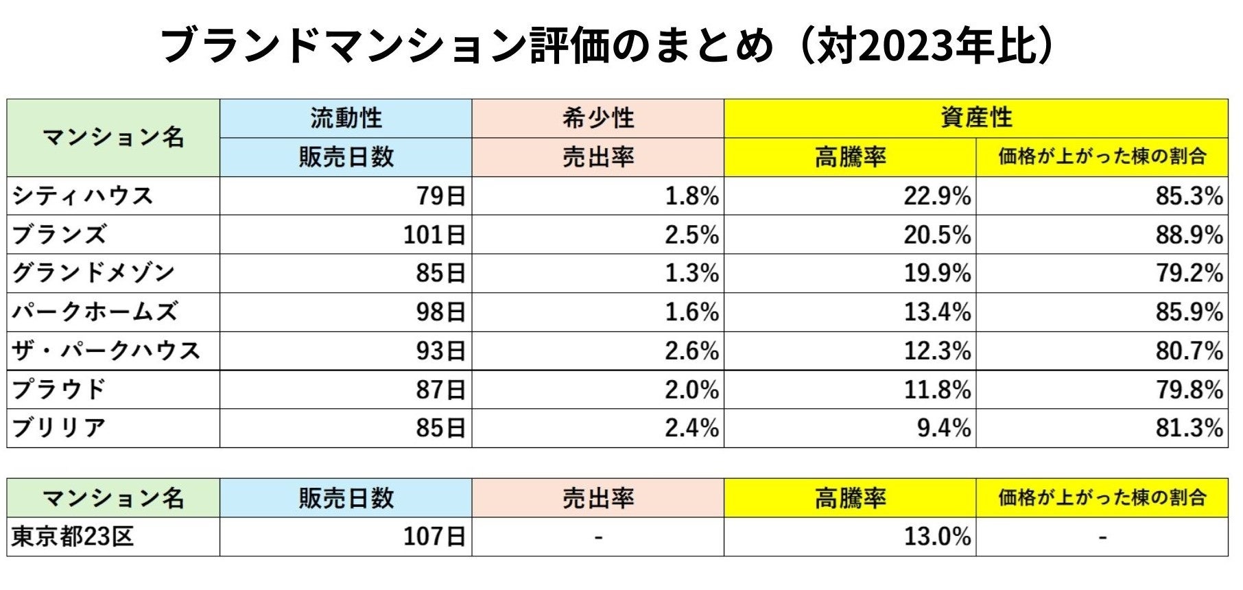 表1は、ブランドマンションごとの「流動性」「希少性」「資産性」を評価してまとめたものです。「流動性」は販売開始から何日で売れるかを示しており、売れる速さを表します。「希少性」は総戸数に対して、1年間で売り出された戸数の割合を示しており、市場への出回りやすさを表します。「資産性」は1年間の価格の高騰率(対2023年比)と価格が上がったブランドシリーズのマンションがどの程度あったかを示しており、文字通り資産としての強さを表しています。