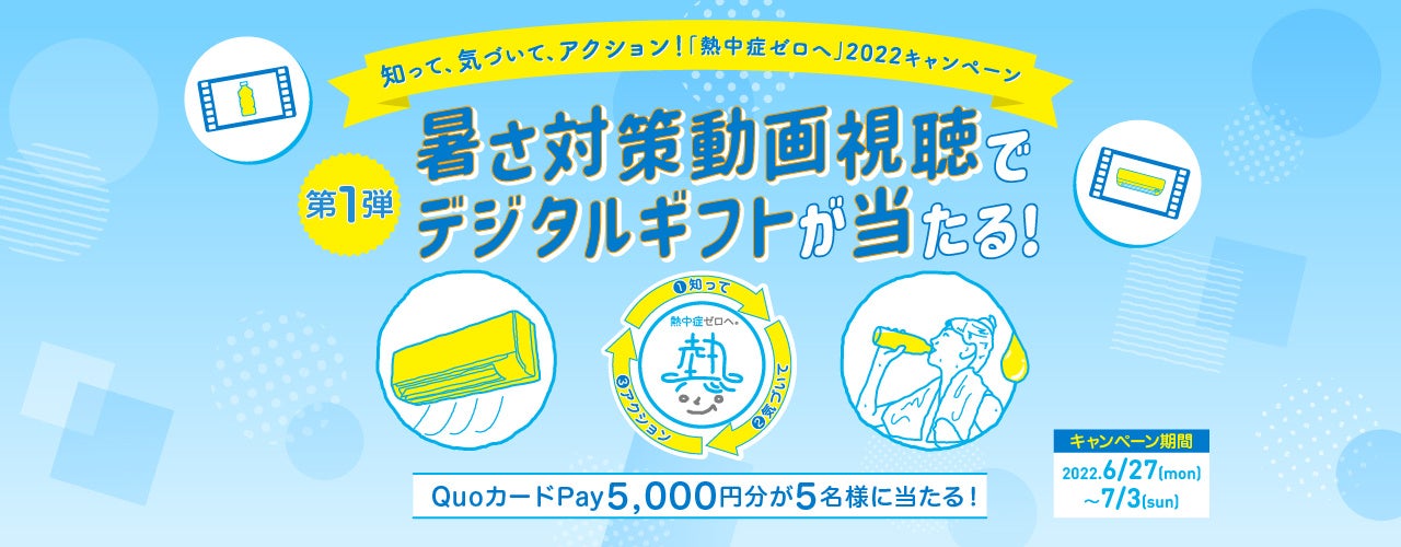 キャンペーン第1弾では、約1分の動画で日本の平均気温の上昇と、水分補給の大切さ、エアコンの使い方について、「熱中症ゼロへ」2022年度オフィシャルパートナーからの解説を含めて紹介します。動画の視聴後にどなたでもキャンペーンにご応募いただくことができ、7月3日(日)までの期間のご応募で、抽選で5名にQUOカードPay5,000円分が当たります。