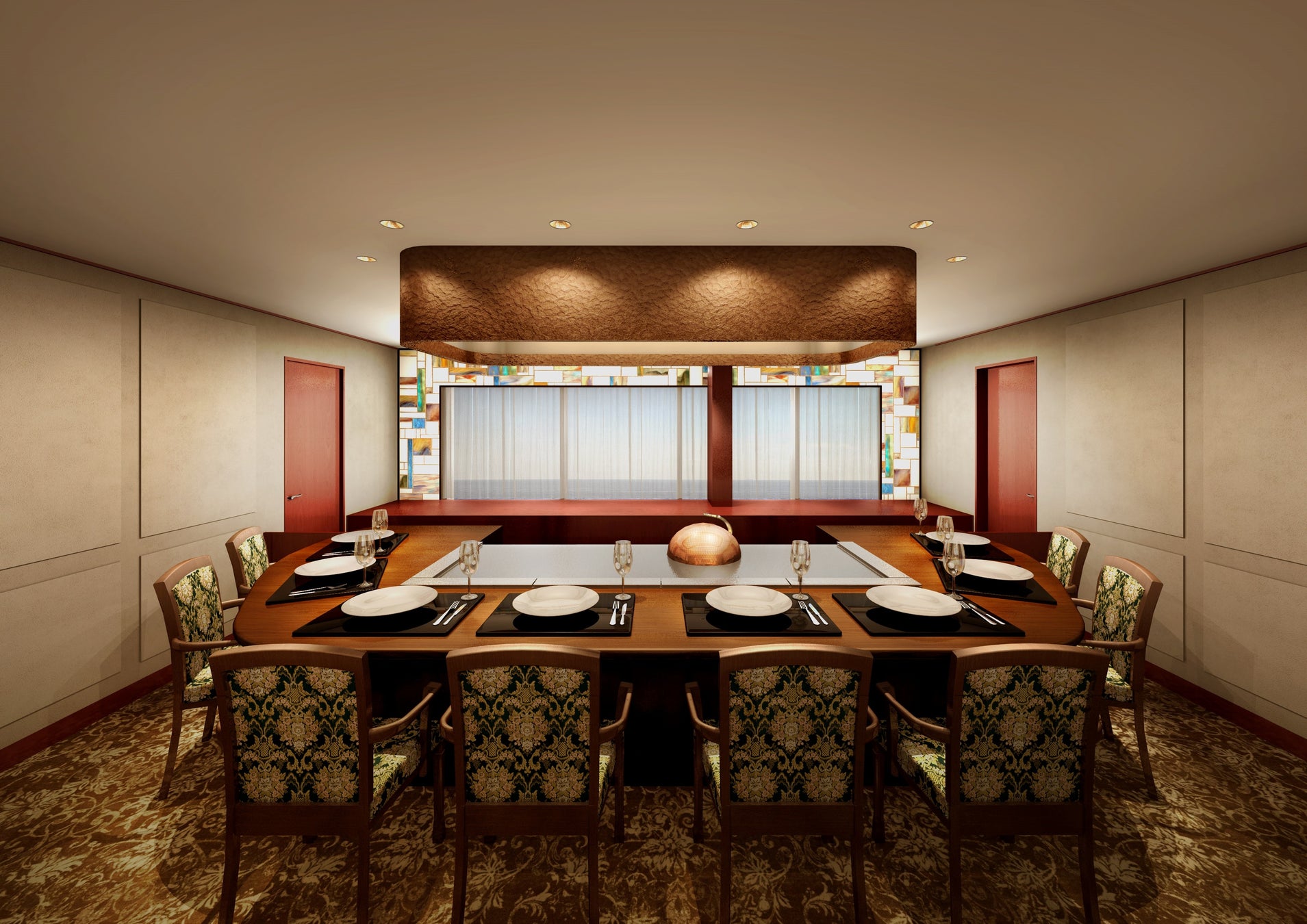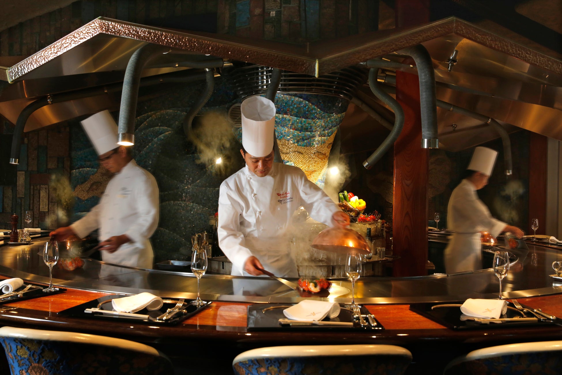 世界各国のゲストをお出迎えするにあたりご用意するのは、長年「うかい亭」で愛されてきた定番料理を交えた特別コースです。料理長が厳選した黒毛和種のステーキをメインに旬の味覚を使った鉄板料理をお楽しみいただけます。シェフの技に目を奪われ、会話を楽しみながら五感を通して、香りや音までも味わえる臨場感を、期間限定の特別な空間でご堪能ください。