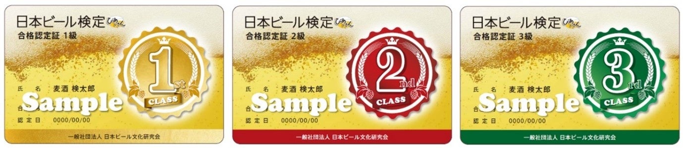 合格者には後日、合格認定証(カード型)を進呈します。デザインは躍動的なビールの液体を背景に、ビールの王冠をイメージした級別のエンブレムを配置しています。