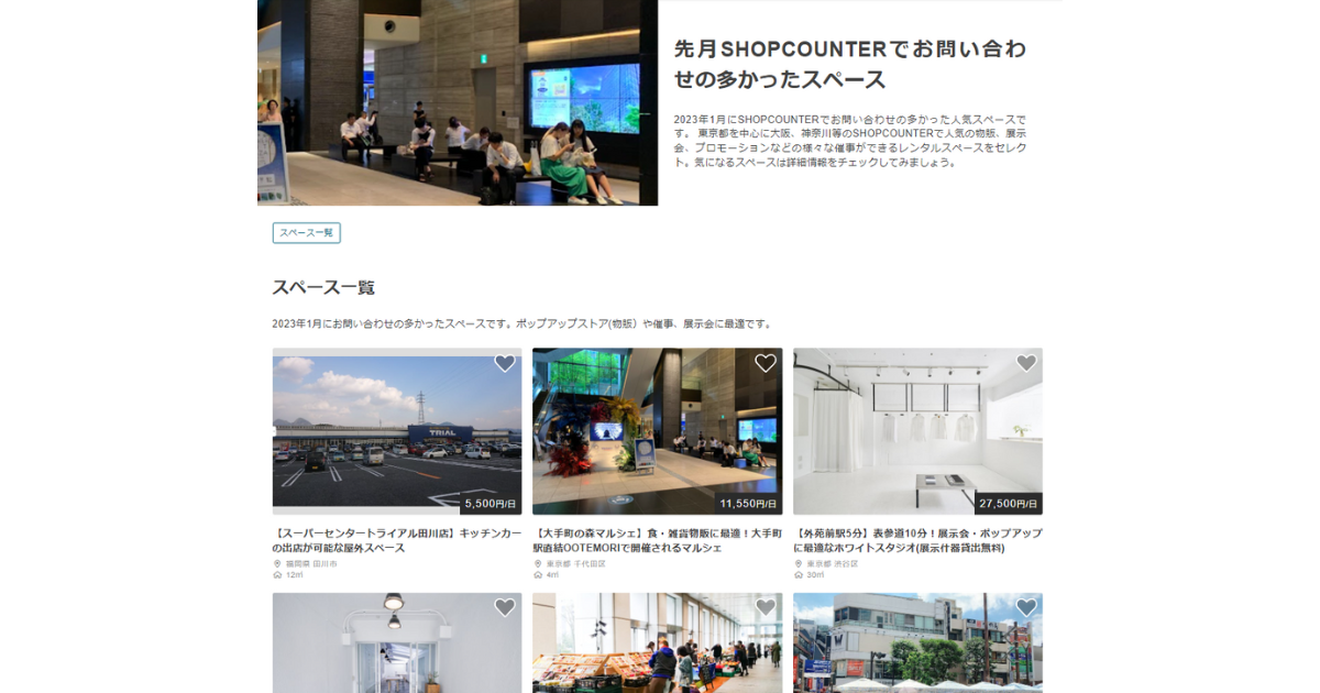 SHOPCOUNTER、2023年1月のポップアップ出店の人気スペース22件を掲載「先月SHOPCOUNTERでお問い合わせの多かったスペース特集」を公開