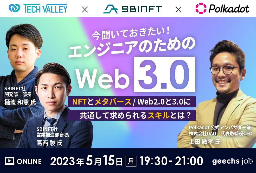 「今聞いておきたい!エンジニアのためのWeb3.0」は、2023年5月15日(月)19:30〜21:00に、Zoomを使用して開催されます。エンジニアに向けてWeb3.0の基礎知識から最新技術の活用事例、NFT業界の「今」などについてお話いたします。