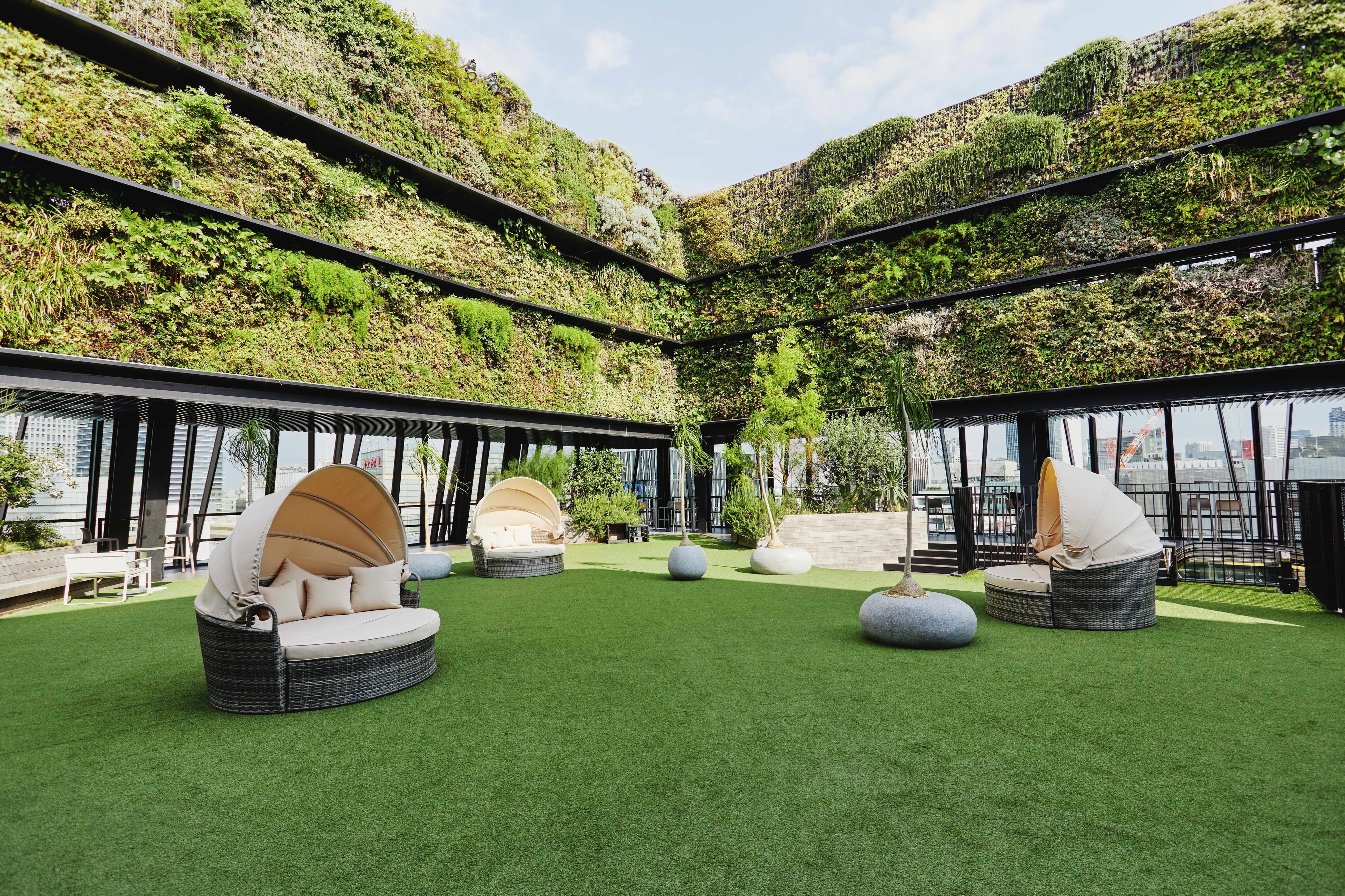 ・都会にいながらも空を感じられる圧倒的な開放感と、グリーンに囲まれた空間