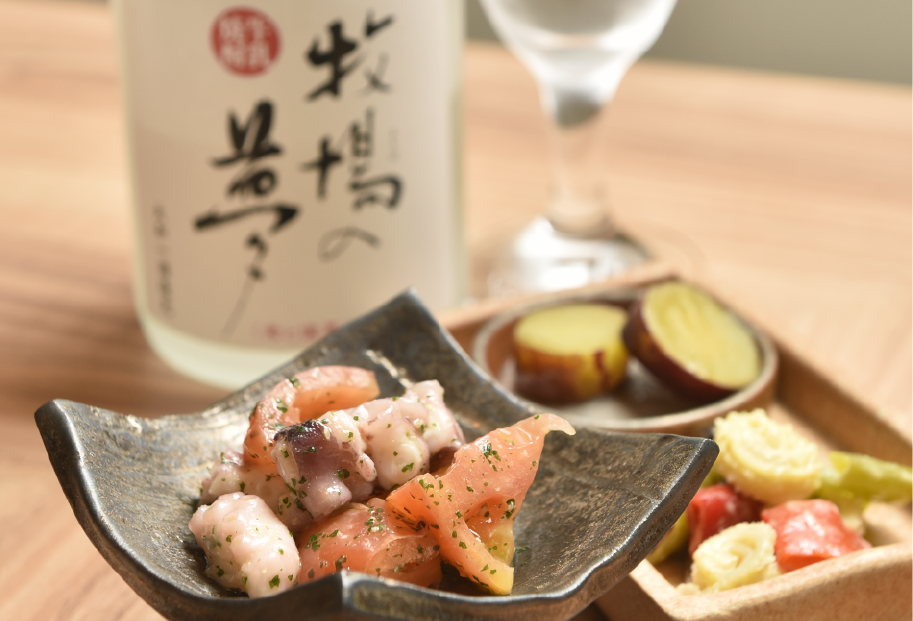 ・牛乳焼酎 牧場の夢 ¥550(税込) 米ベースで温泉水と牛乳を使用した日本唯一の焼酎。- 「熊本県産」の食材を使用した限定メニューをご堪能いただけるお店も登場!熊本の郷土料理「だご汁」や「ASO MILK」を使用したバゲットサンド、「天草大王」の鶏モモを味わえる焼肉も!