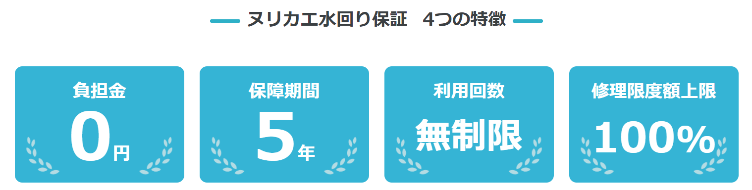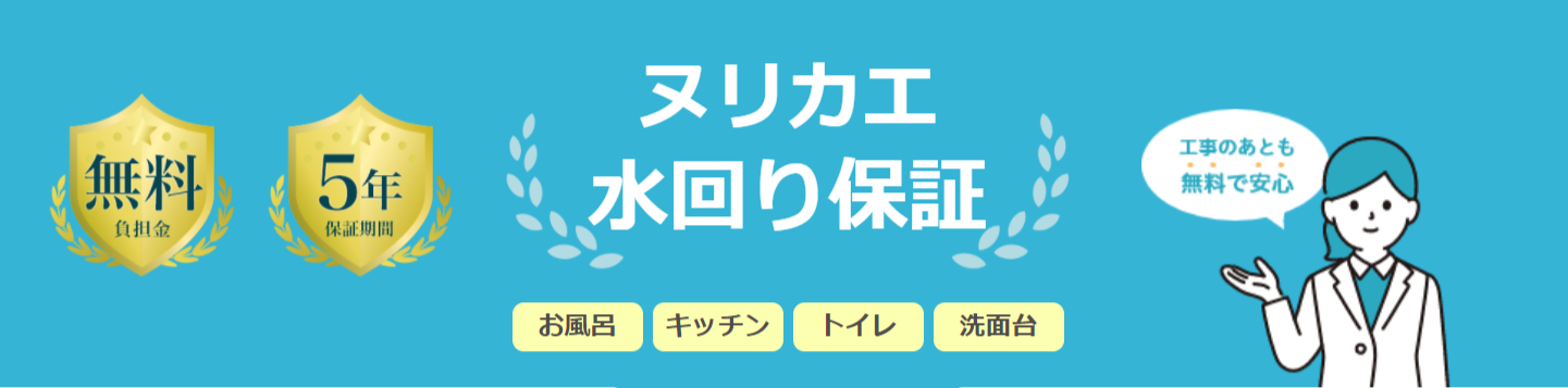 水回りのリフォームにおける保証が通常の1年間から5年間に延長保証するサービスとなります。ヌリカエから紹介された企業で「水回りリフォーム」を行うと、ユーザ様の負担は0「ゼロ」円で5年間、利用回数無制限で保証いたします。
