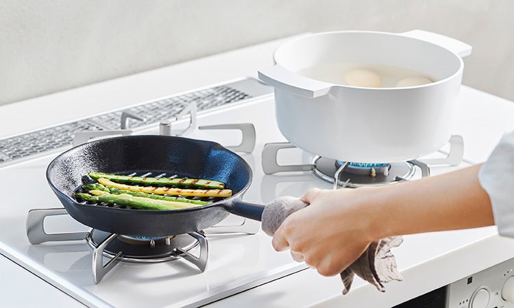 コンロの左右バーナーはどちらも強火からとろ火まで対応。タイマー付きでお好みの設定時間で自動消火し、「ゆですぎ」「煮すぎ」を防ぎます。