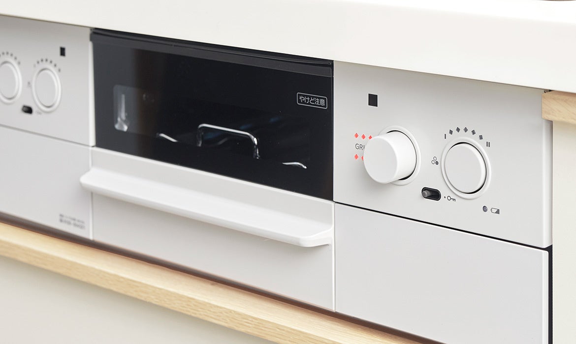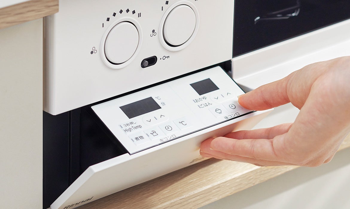 ・ワンプッシュで開く操作部や点火スイッチのつまみも白に統一することで、目につきやすい前面パネルの印象をよりシンプルに。