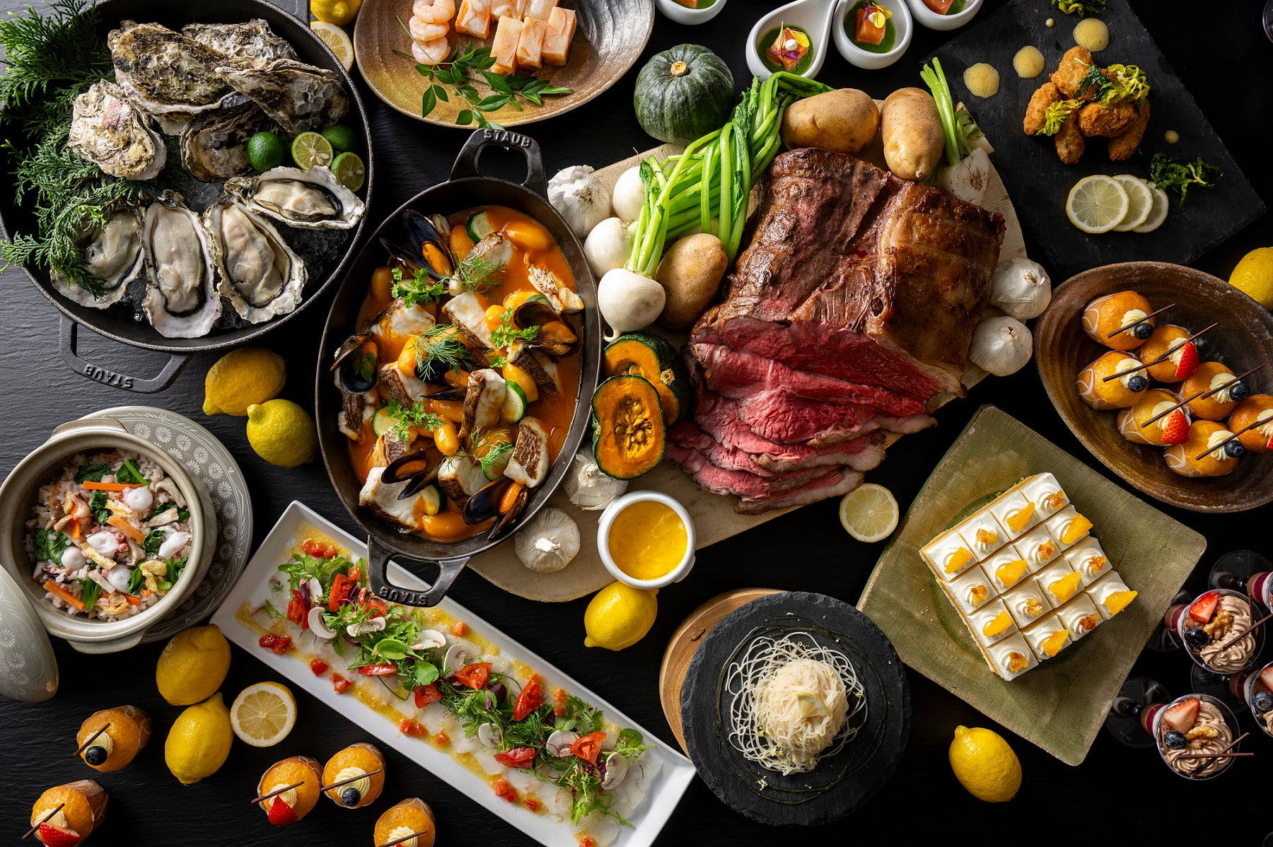「にっぽん美食紀行 ~広島・瀬戸内~」では、瀬戸内の海で獲れた広島県産の牡蠣や濃厚な旨みで知られる「三原やっさタコ」、廿日市の清流で育った「広島サーモン」をはじめ、厳選された魚介をふんだんに使用したメニューをブッフェスタイルでご提供いたします。また、温暖な気候で育まれた肉質の良い岡山の「備前牛」(ランチ)や香川の「オリーブ牛」(ディナー)を使用したローストビーフも格別の味。ライブキッチンにて注文をいただいてからシェフが目の前で切り分けてお召し上がりいただきます。