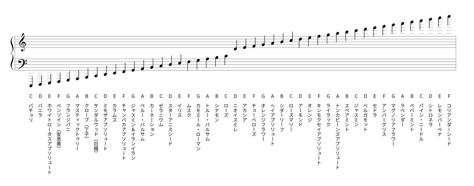 19 世紀後半にイギリスの化学者でもあった調香師セプティマス・ピエスによって考案された、46種類の香料を音階に当てはめたもの。揮発性の高い香りは高音に、低い香りは低音に割り当てられ、和音やオクターブ(高さの違う同じ音)ごとに心地良い香りになるよう設計されています。
