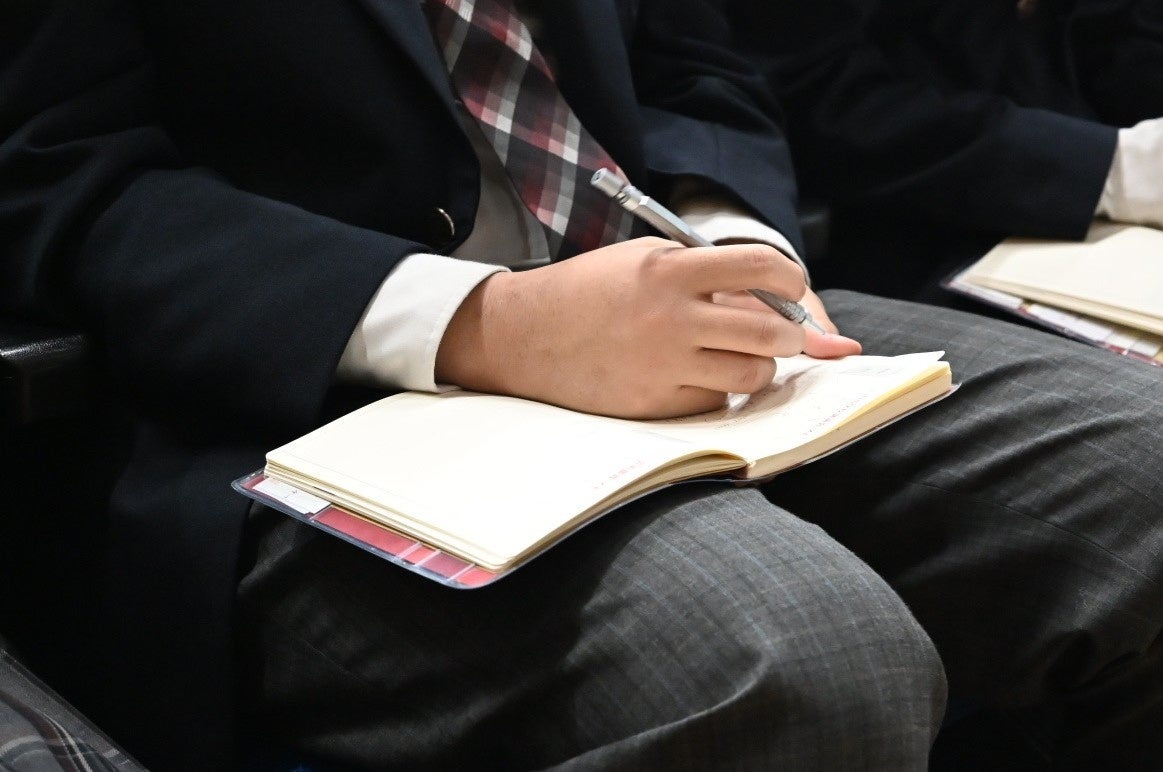 三宅氏は、言語化する際のポイントとして、「具体化」と「自分ごと化」が重要であると指摘。三宅氏は、実際にご自身が読んだ『夜のピクニック』(恩田陸/新潮社刊)での読書体験を例に挙げながら、どのように具体化と自分ごと化をすればよいのか、分かりやすく伝えました。生徒たちは三宅氏の話に真剣に耳を傾け、熱心にメモを取っていました。
