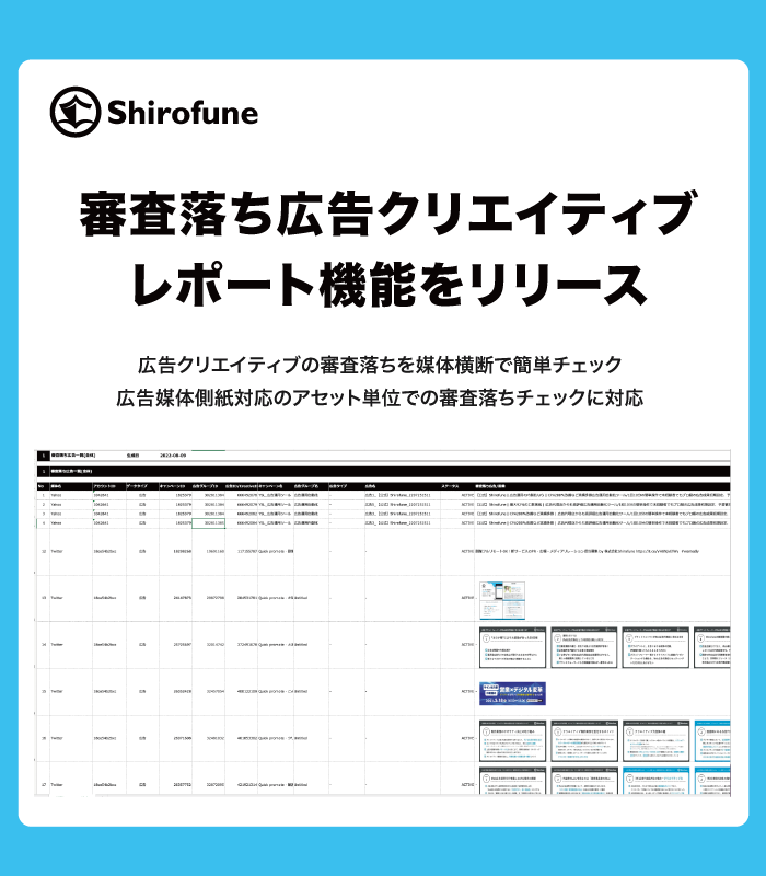 広告運用自動化ツール「Shirofune」に広告クリエイティブ最適化領域の新機能、第一弾は審査落ち広告クリエイティブレポート機能をリリース