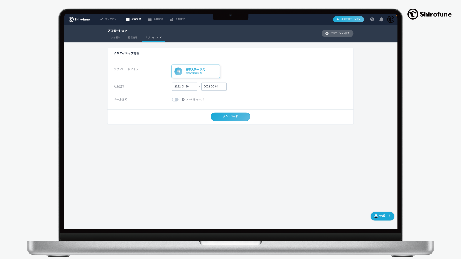 今後はShirofuneから審査落ちした各広告媒体の広告クリエイティブの一覧をワンクリックで統合レポートにすることができ、メール通知機能をオンにすると、新規の審査落ち発生時に自動でレポートが送付されます。