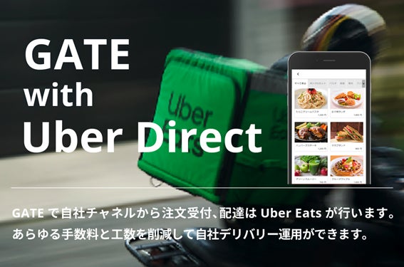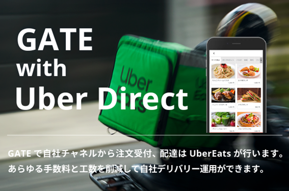「GATEシリーズ 店外モバイルオーダー with Uber Eats」は、GATE店外モバイルオーダーの自社カートから注文を獲得し、Uber Eatsの配達パートナーによって配達ができるデリバリーシステムで、様々なコストを抑えながら自社デリバリーの運用ができます。
