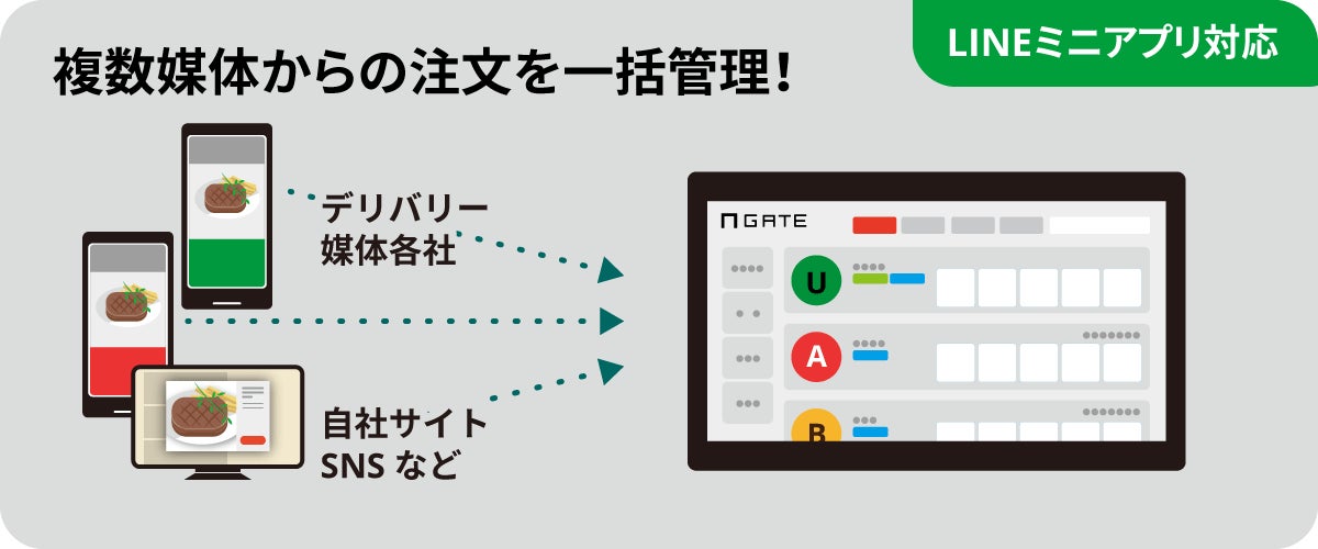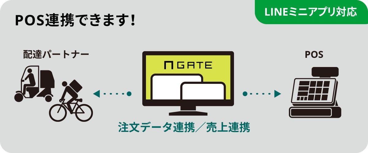 POS連携が可能のため、店舗管理システムとの連携をそのままに「お席トットくん(予約台帳)」、「GATE M/O(テイクアウト・デリバリー、店内モバイルオーダー)」、「注文一括管理くん(デリバリー一元管理システム)」との連携が実現します。さらに、GATEと外部連携しているLINEで予約、LINEミニアプリ、各グルメサイトなどでの空席在庫連携も可能となります。店舗のオペレーション効率化はもちろんのこと、売上アップに貢献します。