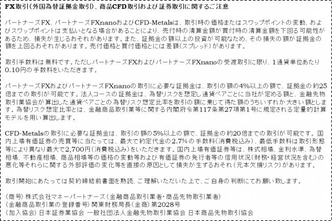主力商品である外国為替証拠金取引では、1万通貨単位、PCからのストリーミング注文は100%スリッページなしで約定力9年連続No.1の「パートナーズFX」※3と、100通貨単位で初心者向けの「パートナーズFX nano」の、2種類のサービスを提供中です。