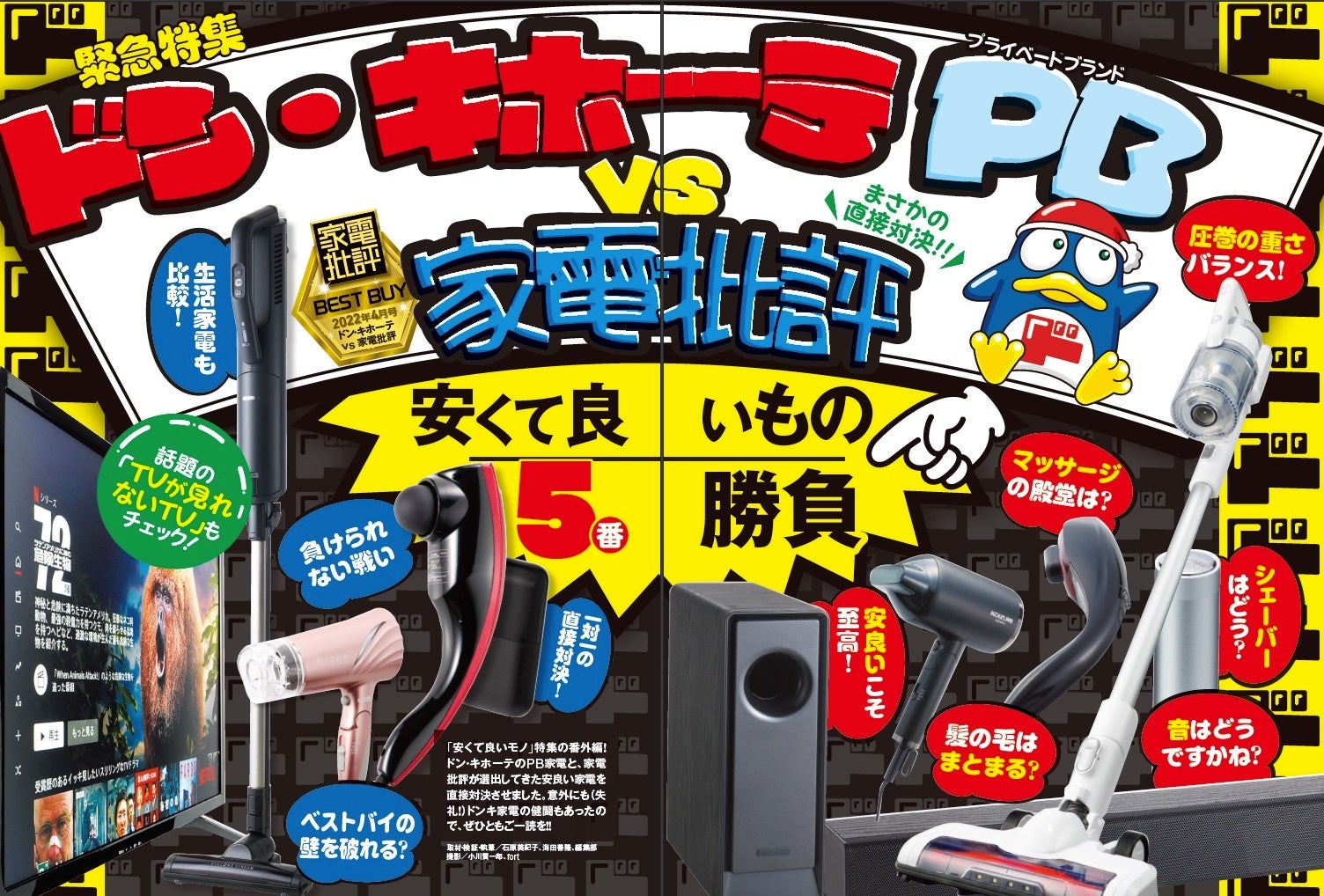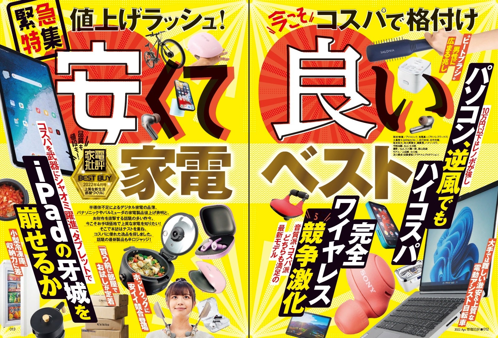 4月号では、コスパに優れた「安くて良い家電」ベストバイ2022を総力特集! ワイヤレスイヤホンやタブレット、パソコン、小型冷凍庫からケトルまで、安くても使えるお墨付き家電を集めました。さらに「最新ドラム式洗濯機No.1決定戦」では、人気の7台を徹底検証し最高の1台を発見! そのほかにも、新型ルンバと1ヶ月生活してみた実録ルポや、話題のドン・キホーテPB家電ガチ検証など、暮らしを快適に変える家電情報満載でお届けしています。 本リリースでは、商品テストに基づく編集部おすすめのベストバイ製品の一部をご紹介します。