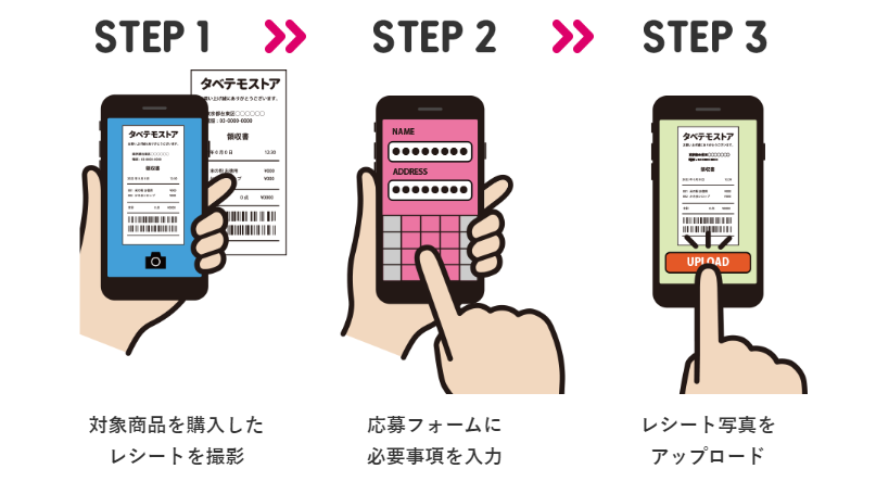 本キャンペーンは、期間中に店舗にて対象商品を購入し、レシートの写真をWEB応募フォームからアップロードすると、抽選で合計110名様に選べるPay1,000円分が当たります。