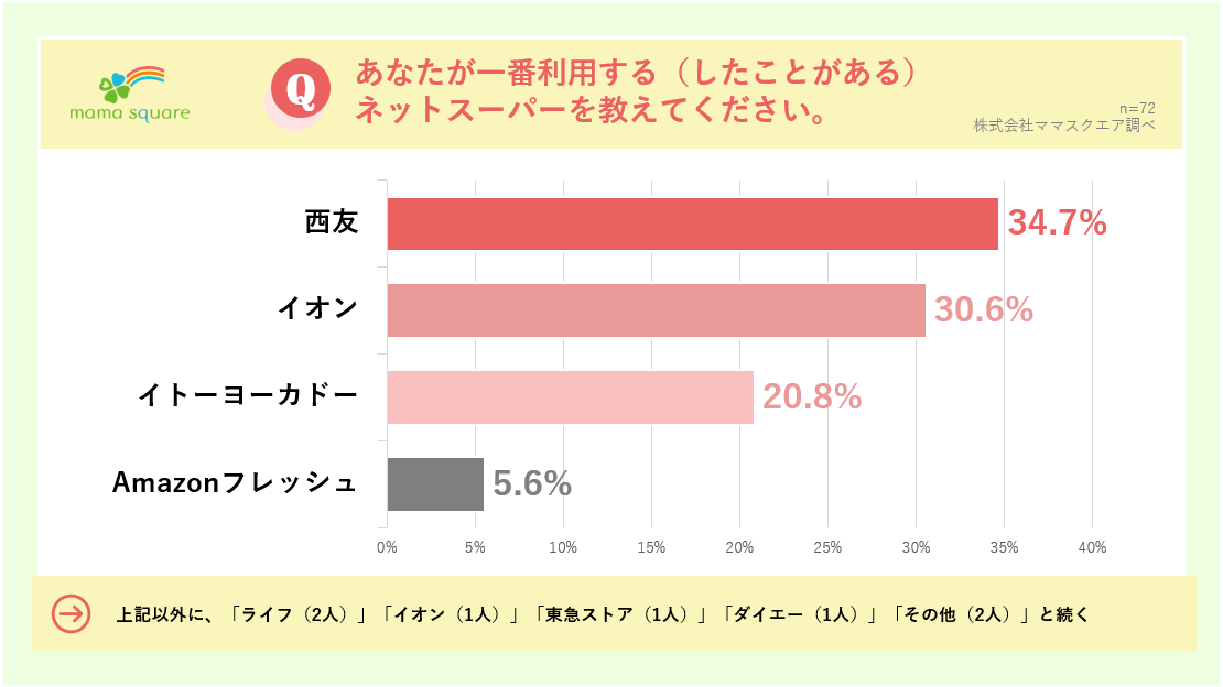 働くママ・女性・子どもに特化したマーケティングサービス『ママスクラボ』を提供する株式会社ママスクエア(東京都港区 代表取締役 藤代聡 以下「ママスクエア」)は、子どもを持つ働くママを対象に「ネットスーパー・食材宅配サービス利用に関する調査」を実施しました。