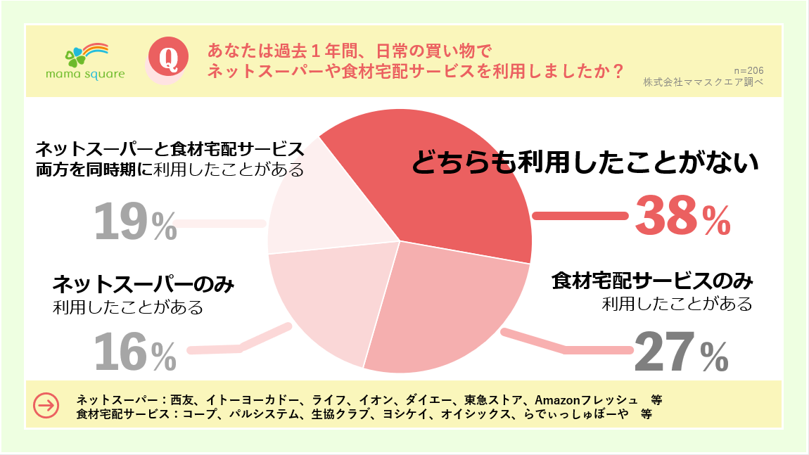 時間と場所を選ばず注文・商品を自宅まで届けてもらえるネットスーパーと食材宅配サービス。買い物に行く時間や労力を削減できる期待が持てるものの、38%のママが「どちらも利用したことがない」という結果に。一方「食材宅配サービスのみ利用」は27%で、「ネットスーパーのみ利用」より11%上回り、「ネットスーパーと食材宅配サービス両方を同時期に利用」が19%の結果となりました。