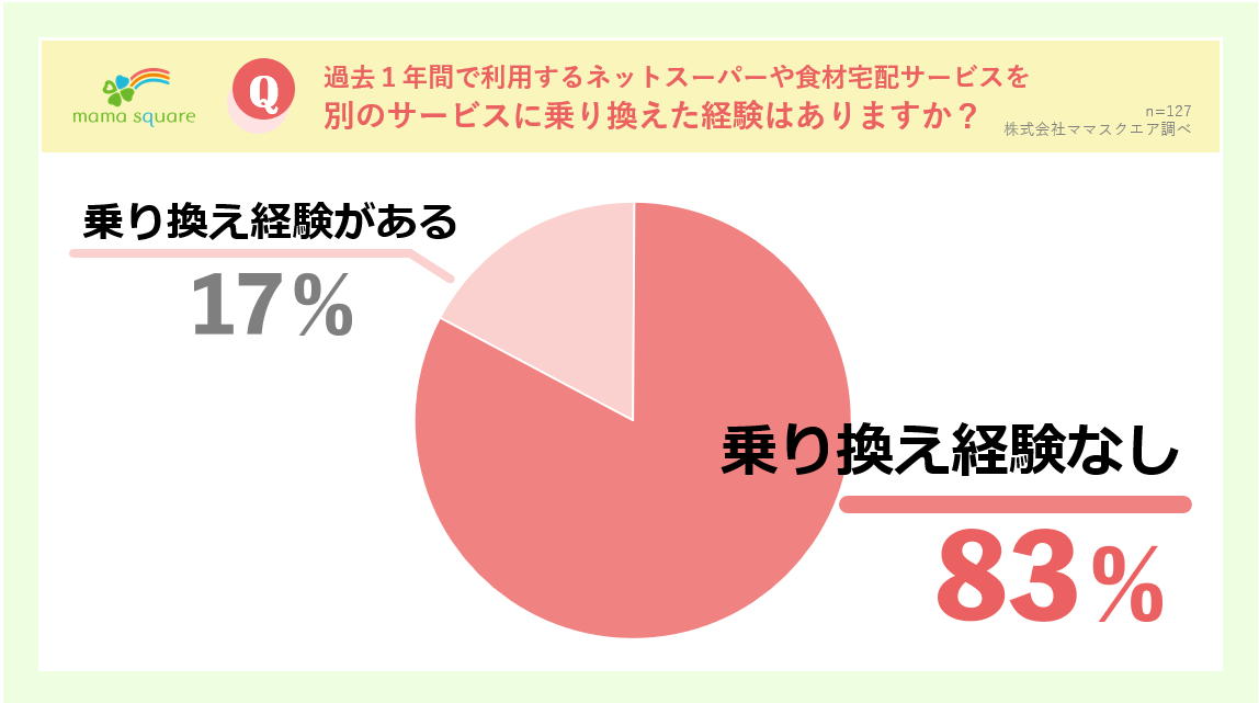 「乗り換えをしない」2大理由は「現在のサービスに満足している」「サービスを乗り換えるが面倒だから」となり、「乗り換えをする」きっかけは、配送時間の柔軟性や子どもの成長・商品の充実に伴う理由となった。