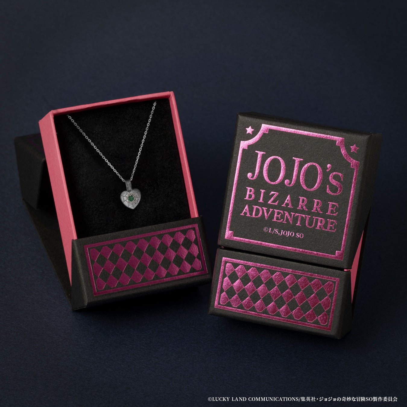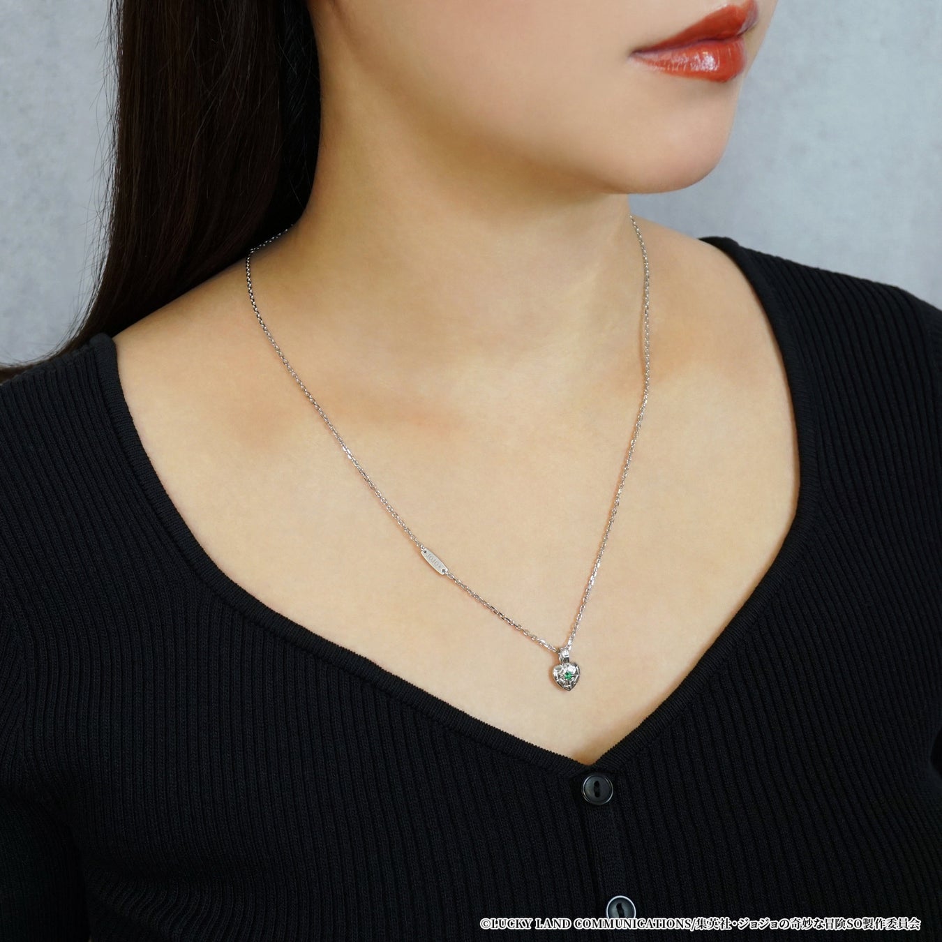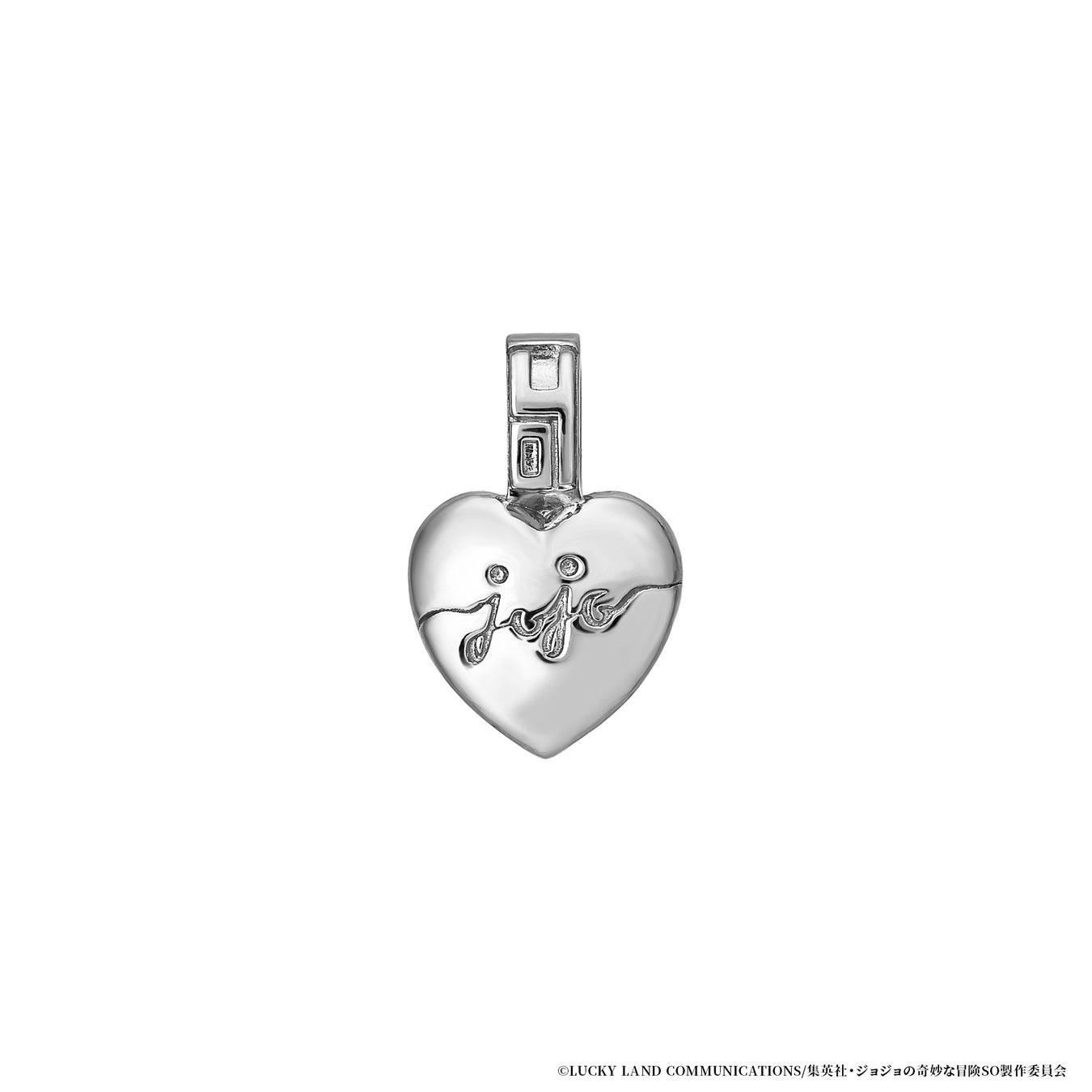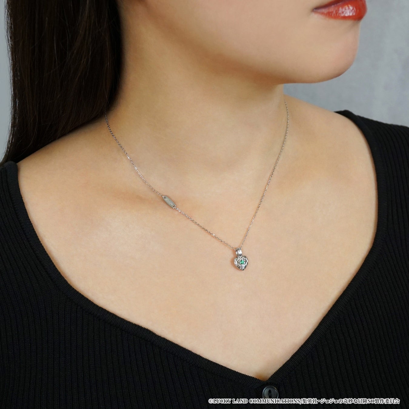 中央には空条徐倫の瞳のカラーをイメージした鮮やかなグリーンクォーツをセッティング。胸元のハートデザインに星の痣やスタンドの糸を取り入れデザインしました。裏側は愛称の『JOJO』を糸で描いたイメージで仕上げています。