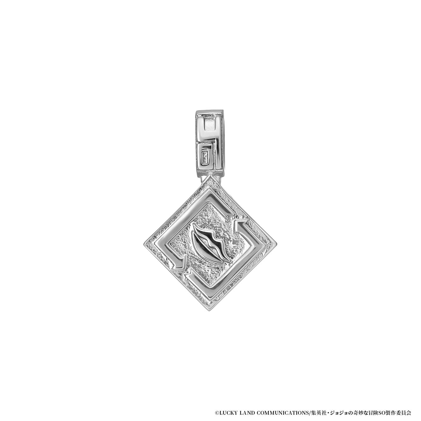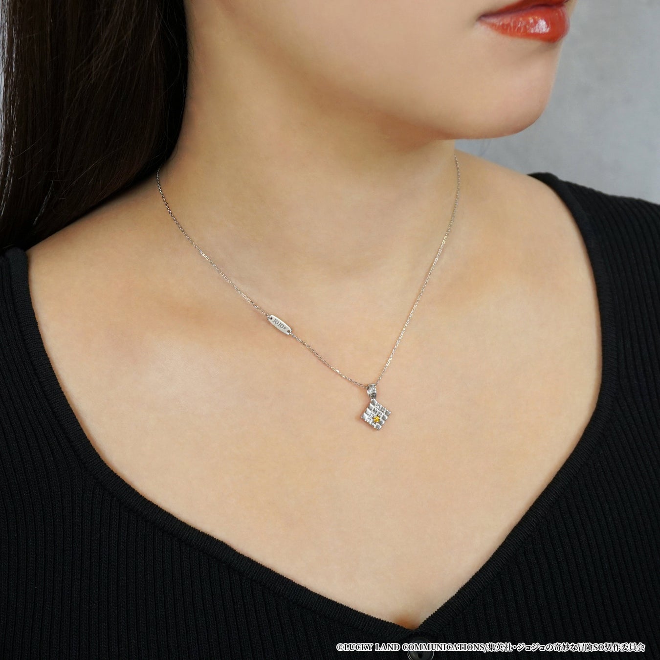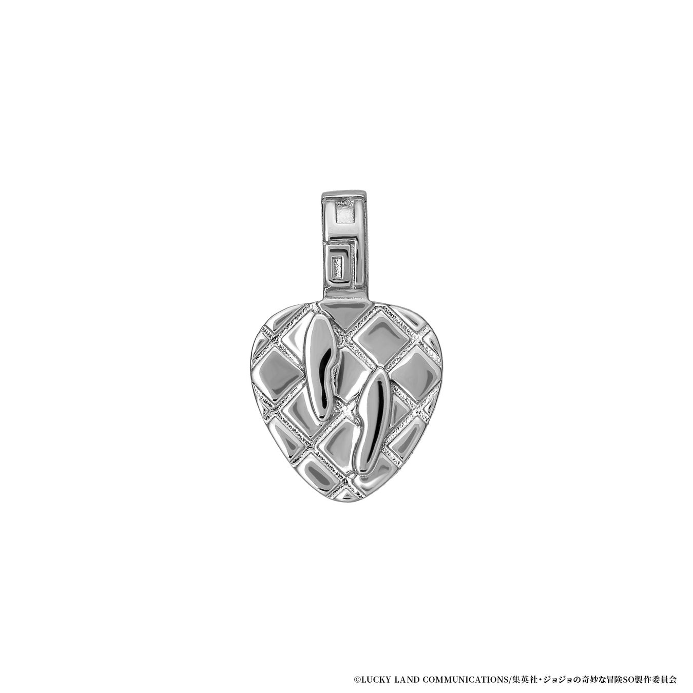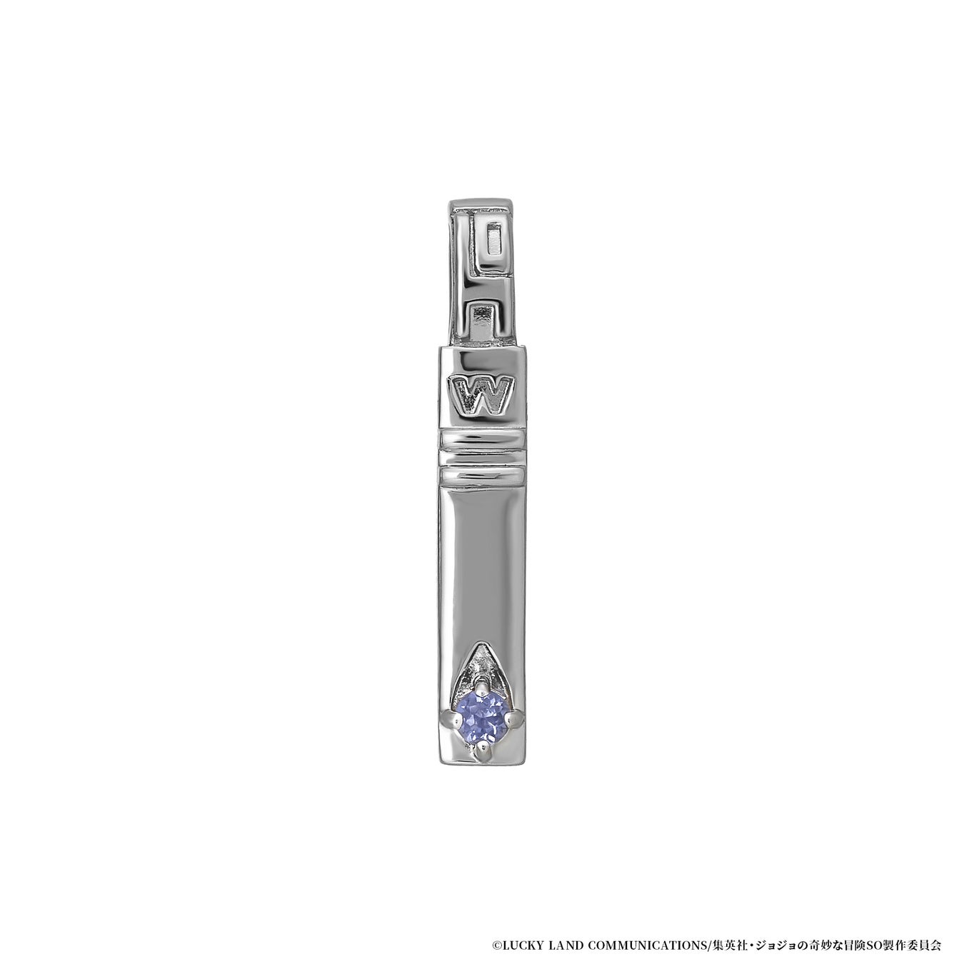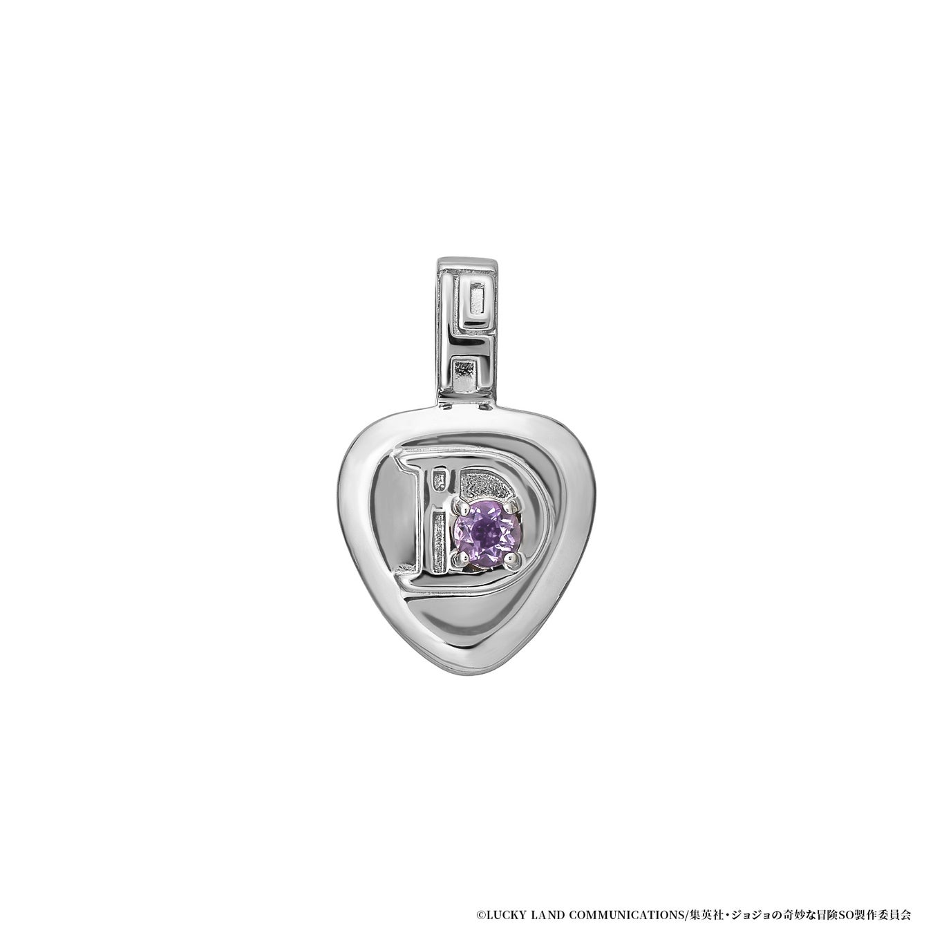 中央には空条徐倫の瞳のカラーをイメージした鮮やかなグリーンクォーツをセッティング。胸元のハートデザインに星の痣やスタンドの糸を取り入れデザインしました。裏側は愛称の『JOJO』を糸で描いたイメージで仕上げています。