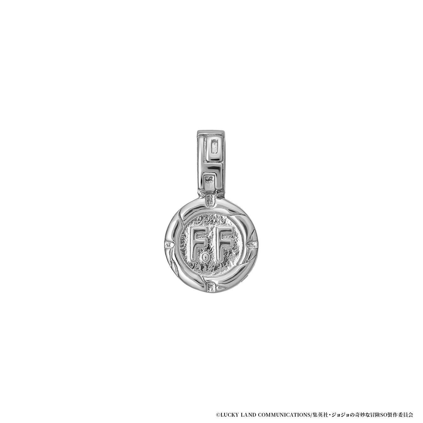 愛称の『F・F』をグラフィカルに表現し、スタンドの肩パーツと腕や足の模様を全体に取り入れています。裏側の中央にはF・Fの髪色をイメージしたペリドットをセッティング。特徴的な髪形をデザインしました。