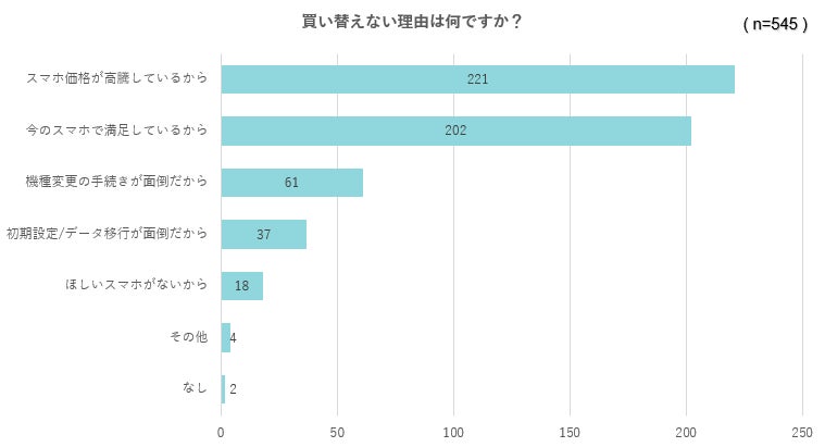 「スマホを買い替えない理由は何ですか?」と質問した所、最も回答数が多かったのは「スマホの価格が高騰しているから」で221名(40.6%)でした。