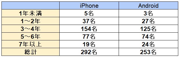 iPhoneは約5年と言われているため、Androidユーザーのほうが早い段階で買い替えるのではないか?と予想していましたが、意外な結果となりました。