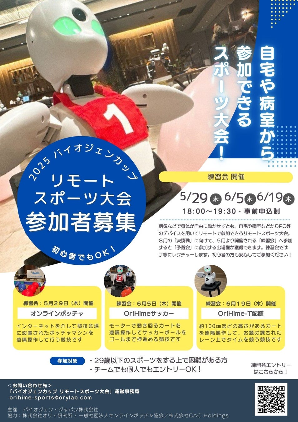 バイオジェン・ジャパン株式会社(本社:東京都中央区、代表取締役社長:傳幸諭)、株式会社オリィ研究所(本社:東京都中央区、代表取締役:吉藤健太朗・笹山正浩)、一般社団法人オンラインボッチャ協会(所在地:埼玉県戸田市、代表:大川秀治)は、身体を動かすことが難しくとも、自宅や病室などの遠隔地から、リモートで参加することができるスポーツ大会「2025 バイオジェンカップ リモートスポーツ大会」を2025年8月24日(日)に開催することを決定いたしました。