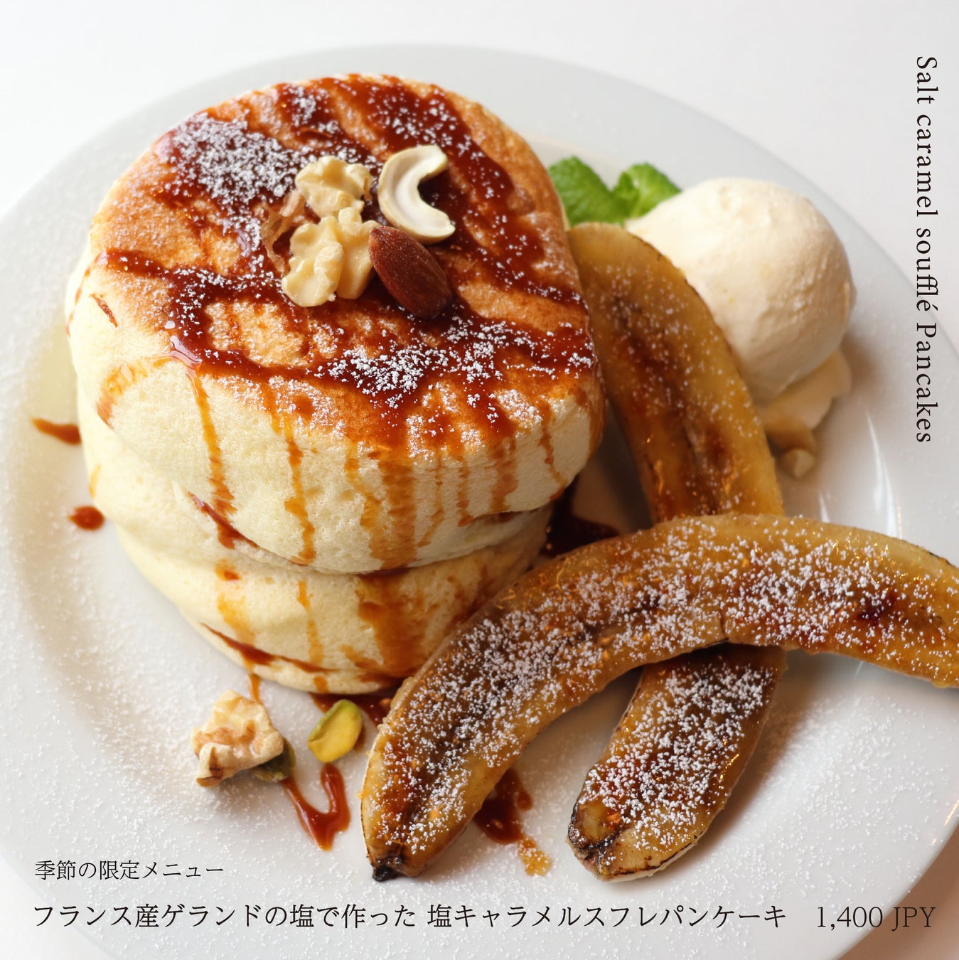 今回のパンケーキは甘さのなかに苦味や塩味を感じられる”塩キャラメル”。ゲランドの塩は【海の果実】と呼ばれ、フランスのブルターニュ半島南部のゲランドの塩田で海水から作られた顆粒の塩です。1500年以上にわたり、塩職人たちが先祖代々からの製塩法を守り続け、滋味豊かな海塩を収穫しています。