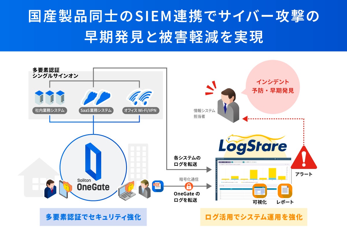 株式会社ソリトンシステムズ(代表取締役社長:鎌田理、以下ソリトン)と株式会社LogStare(代表取締役:米今政臣)は、技術連携を実施し、ソリトンの多要素認証サービス「Soliton OneGate(以下OneGate)」が出力したログを、次世代マネージド・セキュリティ・プラットフォーム「LogStare」が適切に収集・分析できることを確認しました。