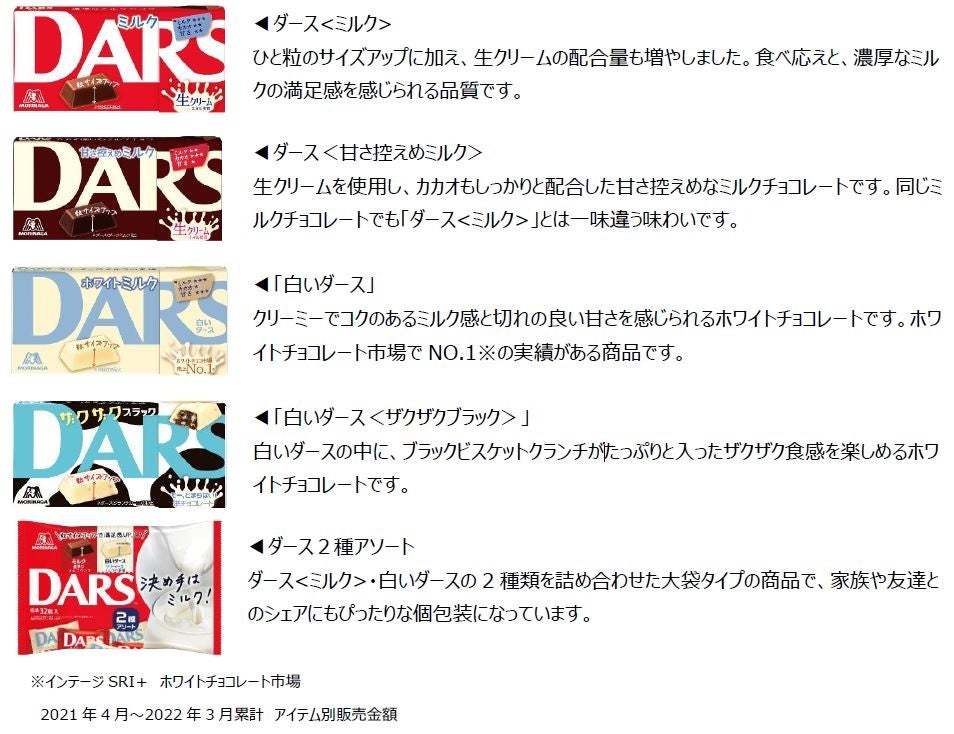 森永製菓株式会社(東京都港区芝、代表取締役社長・太田 栄二郎)は、ミルクにこだわった粒チョコレート『ダース』の「ダース<ミルク>」、「白いダース」、「ダース2種アソート」を9月20日(火)からリニューアル発売し、また「ダース<甘さ控えめミルク>」、「白いダース<ザクザクブラック>」を新発売いたします。
