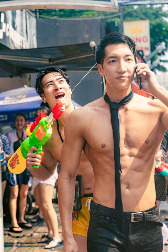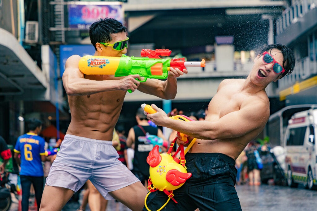 「ソンクラン期間中のタイで水かけ祭りに巻き込まれるビジネスマンマッチョ」