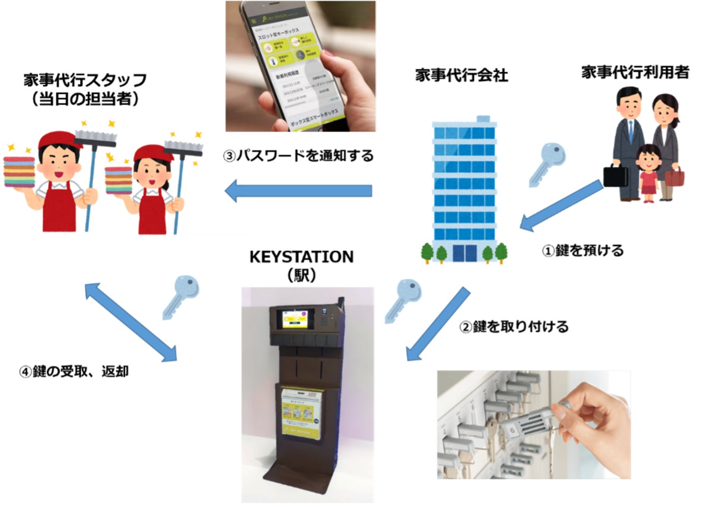 カギの無人受け渡しサービス「KEY STATION」は、駅やマンション、宿泊施設、コインランドリーに設置されています。