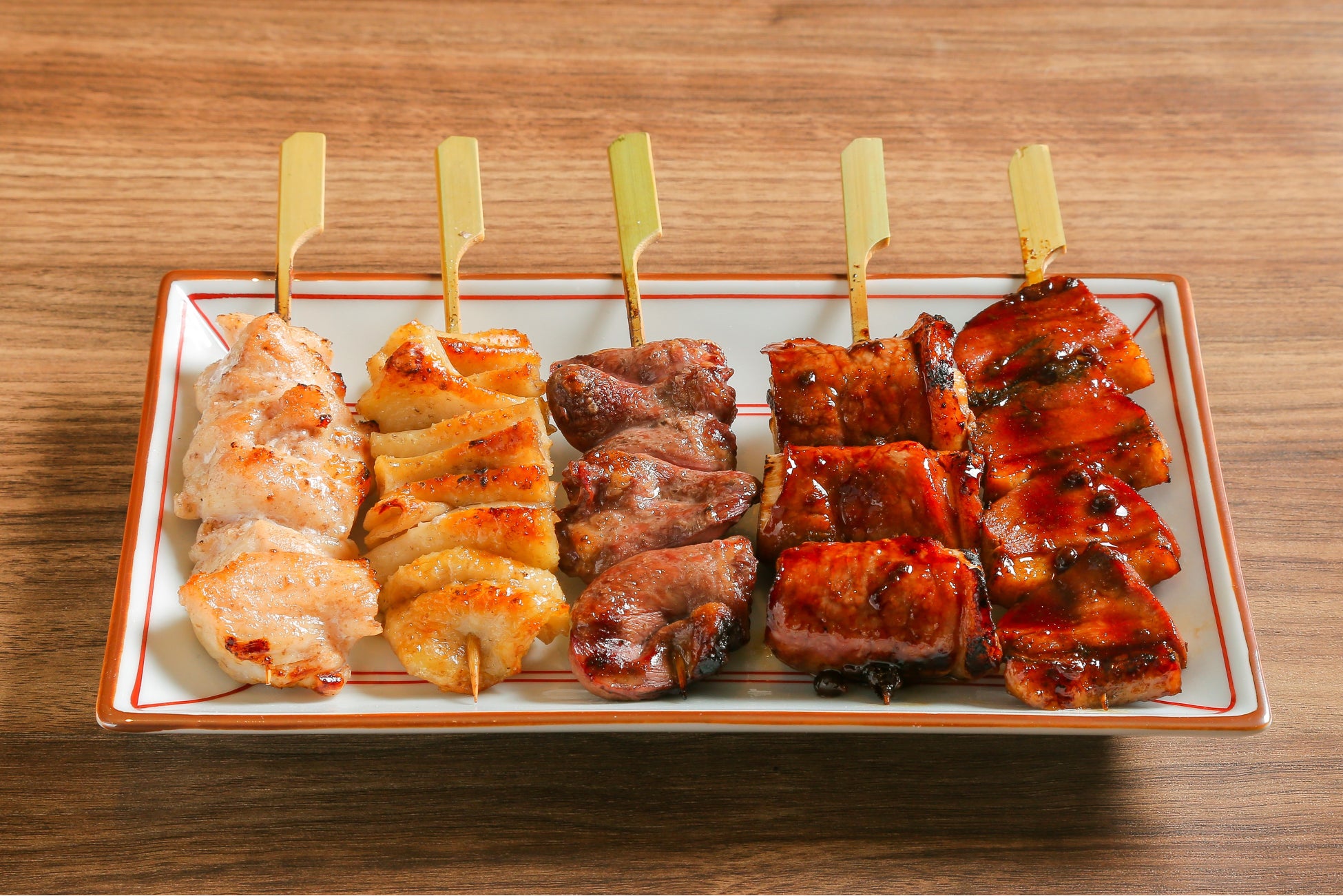 鴨ねぎま、鴨ロース、鳥かわ、レバー、フリソデの5本盛り。鴨串に使用する「謹製山椒だれ」はやみつきになる味で、ビールやハイボールにぴったりです。