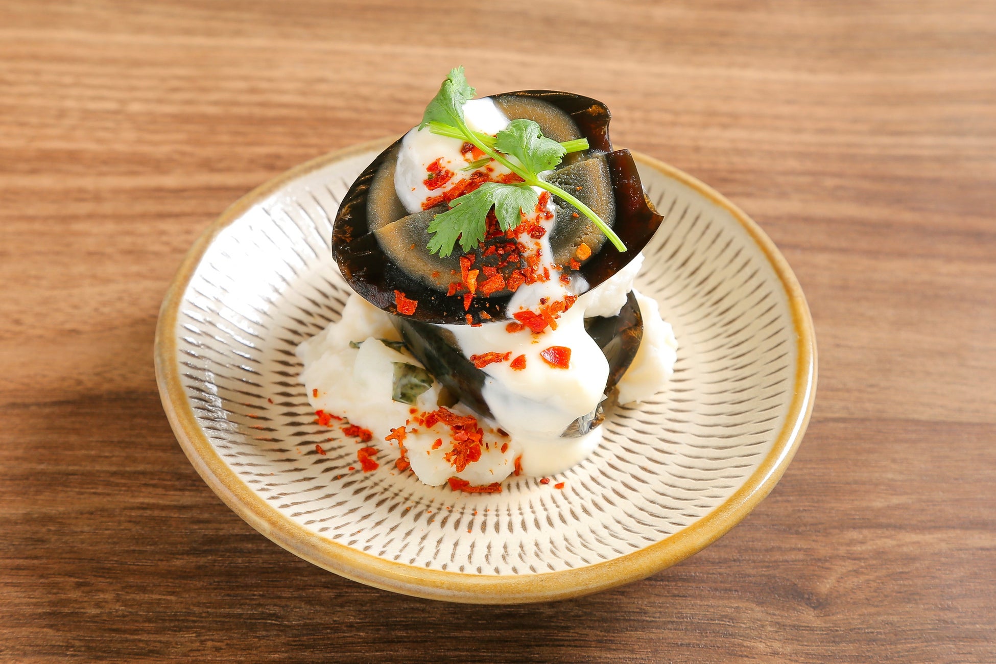 フランスの究極のゆで卵料理「ウフマヨ」を中華風にピータンを使ってアレンジした見た目も楽しい逸品。