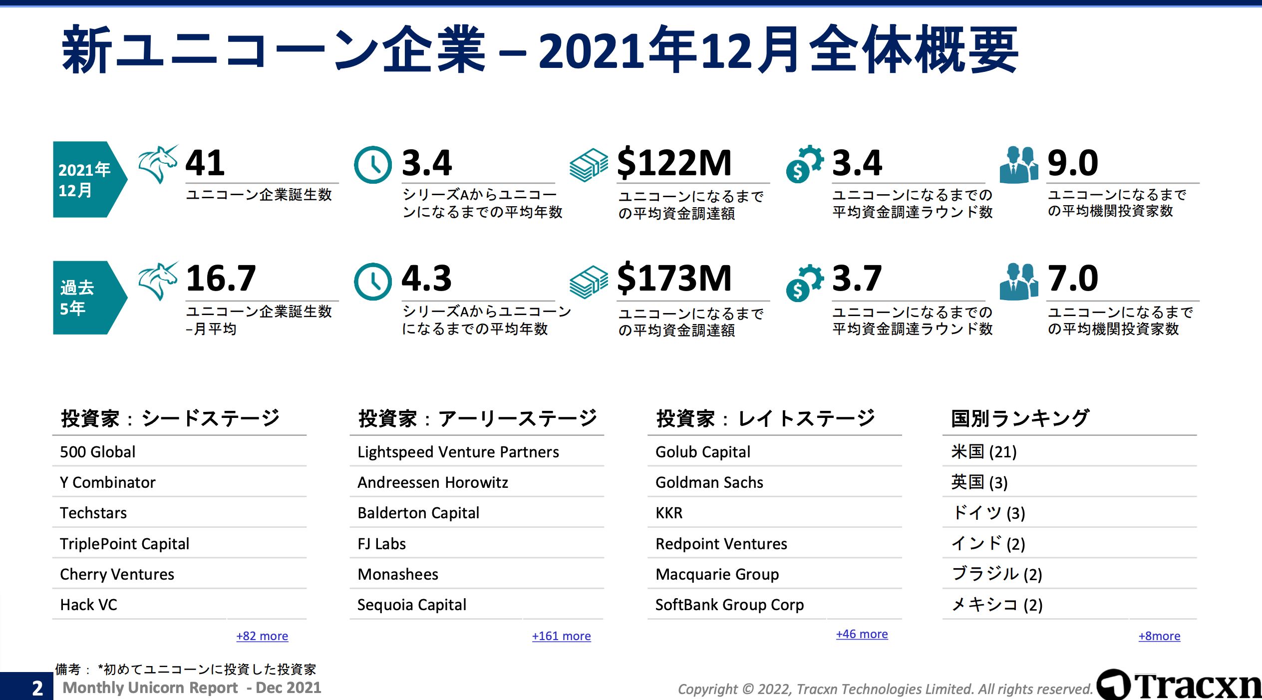 イシン株式会社(本社:東京都新宿区 代表取締役社長:片岡 聡)は、スタートアップデータ分析サービス「Tracxn」による「2021年12月 Monthly Unicorn Report」の日本語訳版をリリースいたしました。